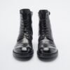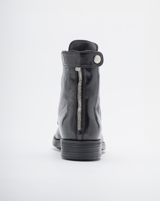 Black premium leather boots with low heel, almond toe and rear closure.