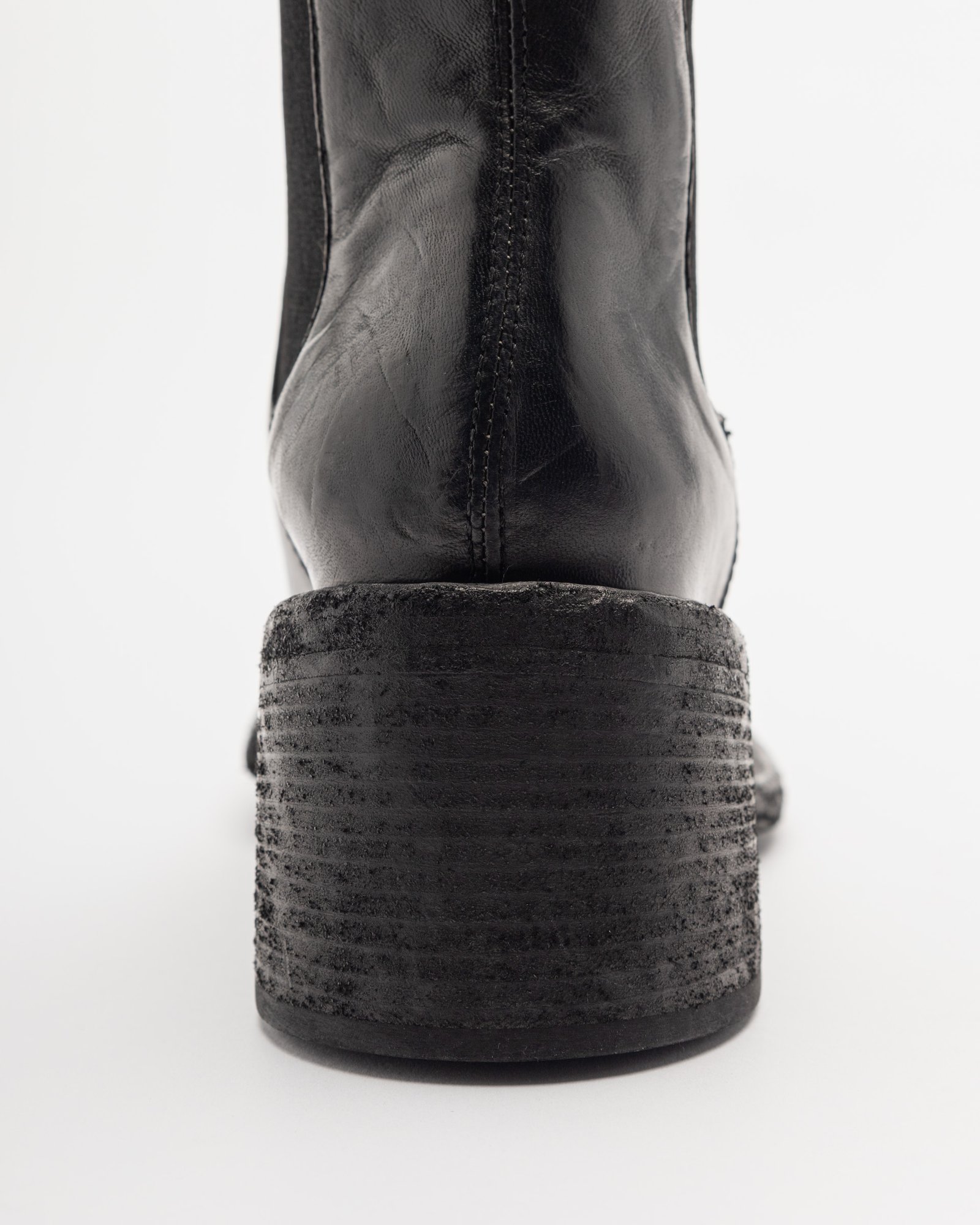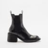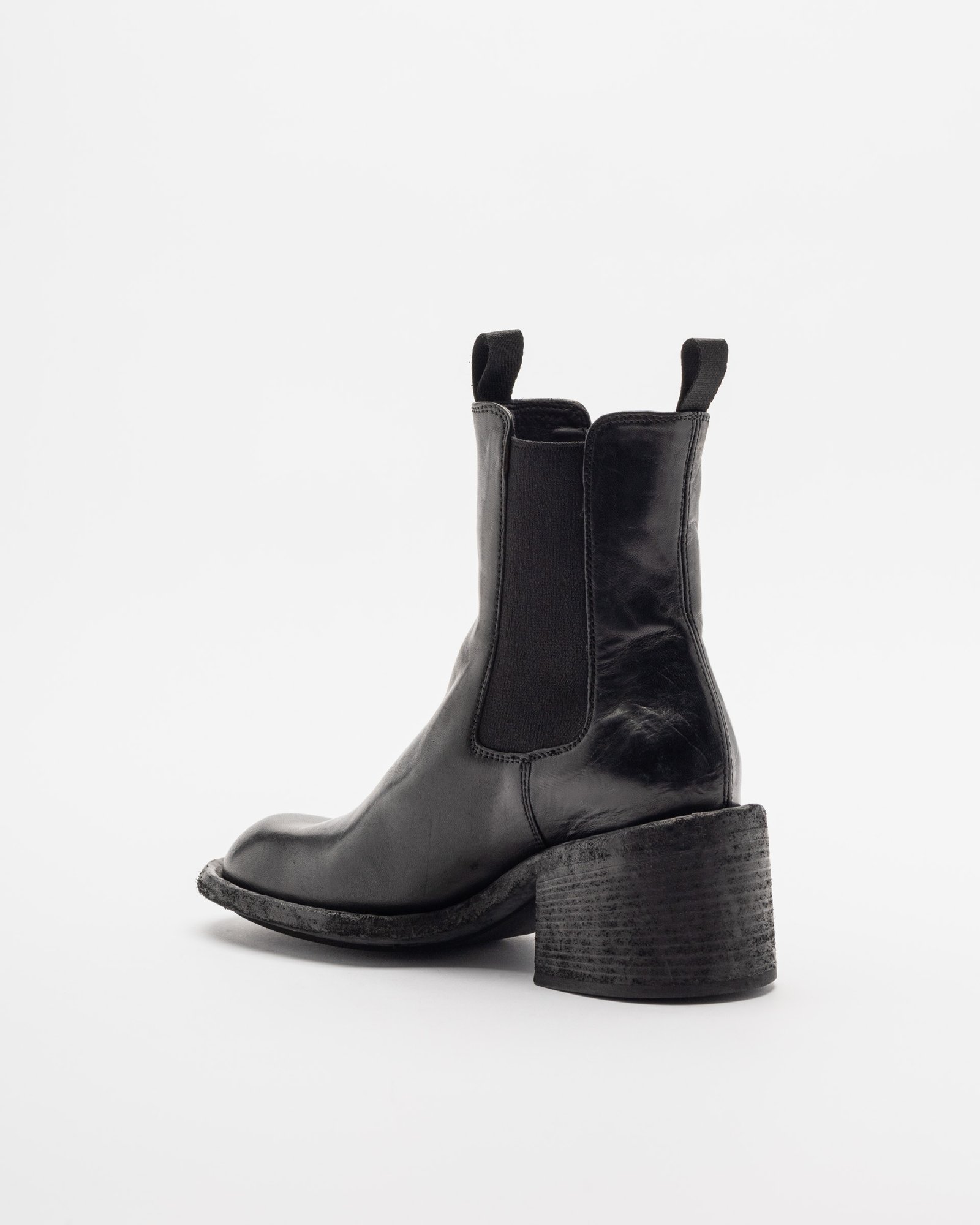 Black leather Chelsea boots by Officine Creative. Round toe, block heel, and pull tabs at the top.