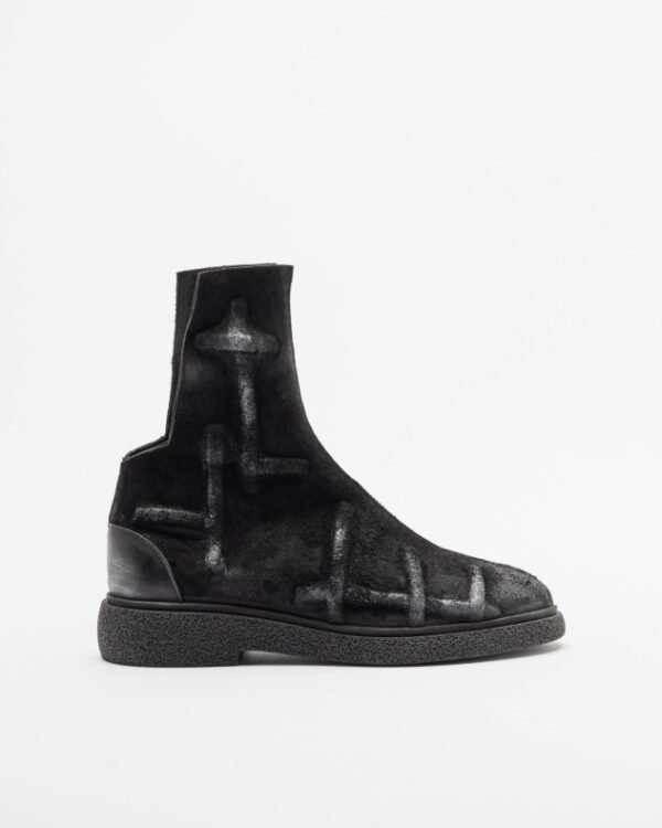 Black suede boots with open back, embossed details and front zip.