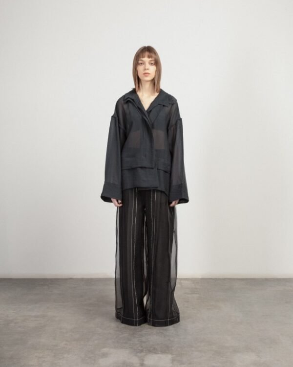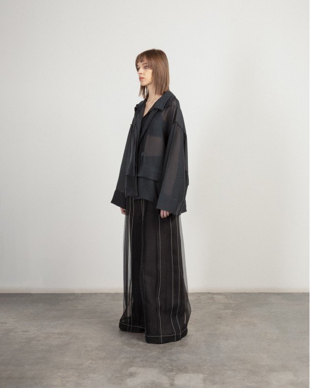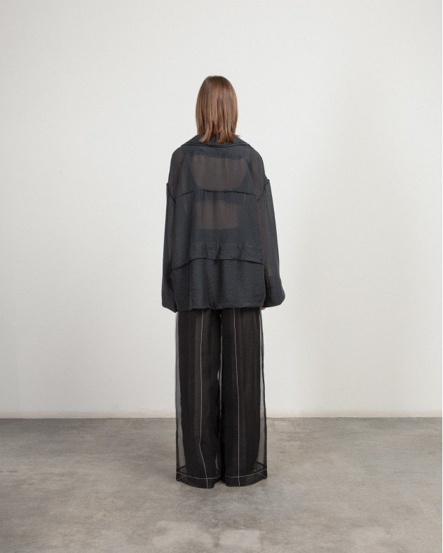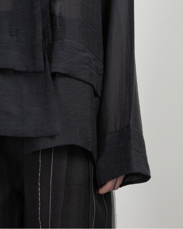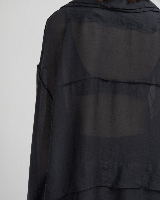 Black shirt with slight transparency, wide sleeves and overlapping fabric.