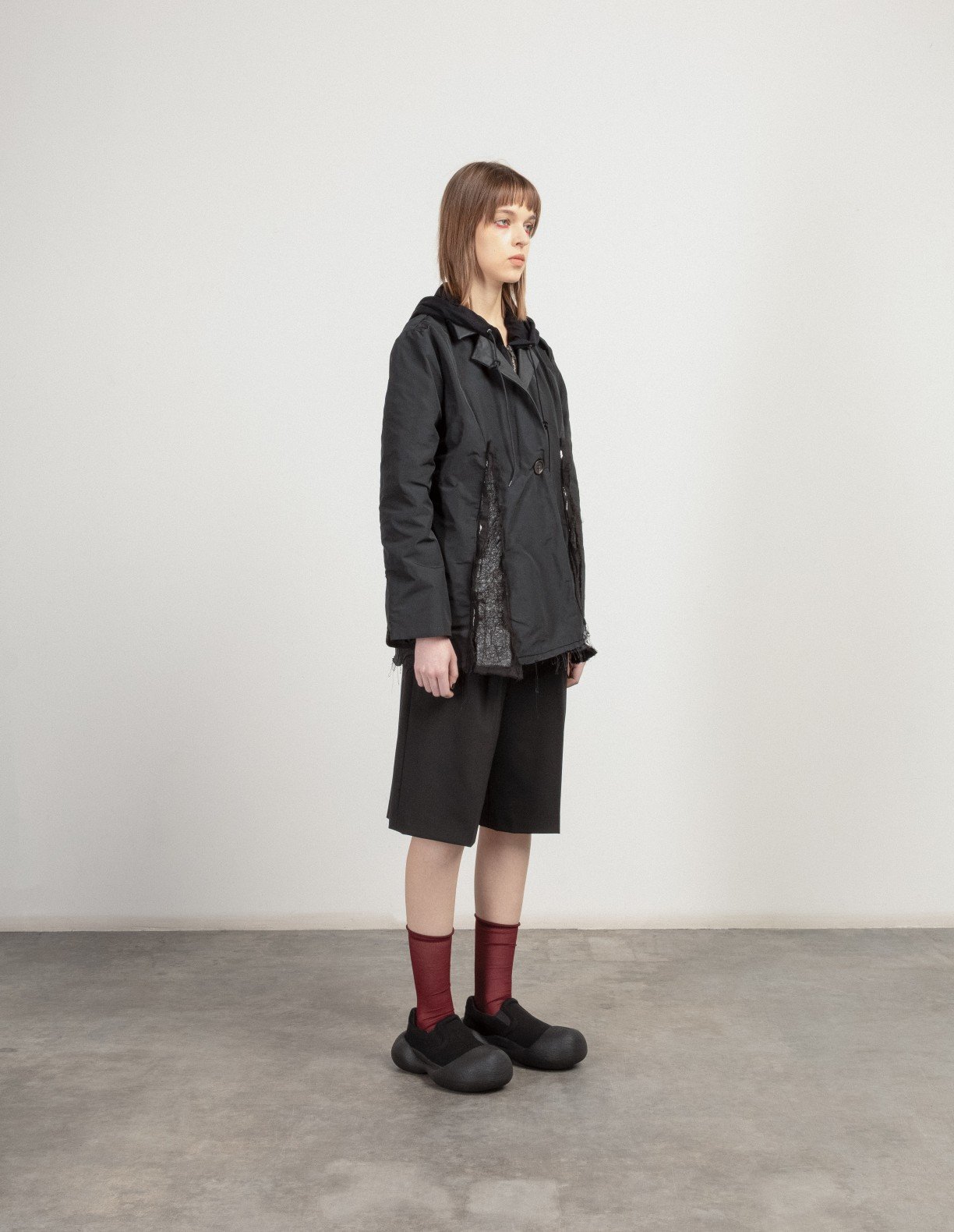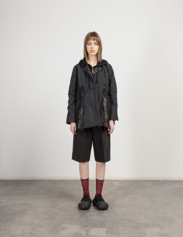 Black coat with adjustable hood, leather lapels, and metallic details on the front.
