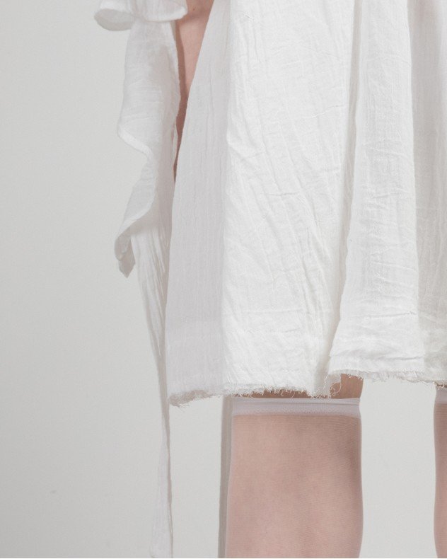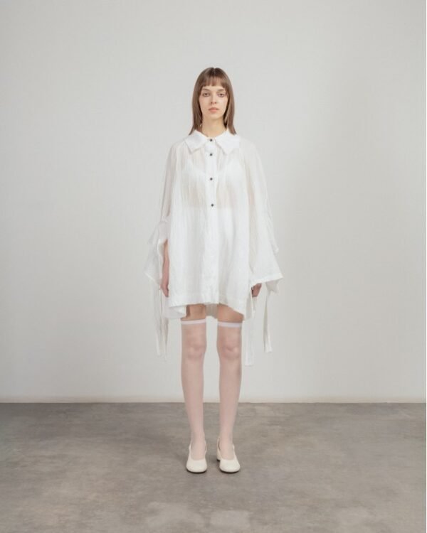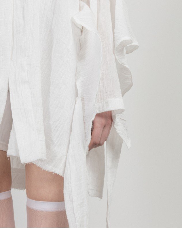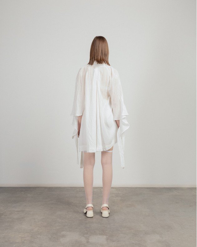 Oversized short-sleeved shirt with wrinkled effect and arm straps. Contrasting button fastening.