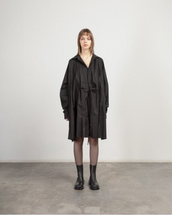 Asymmetric black shirt with leather collar, draped detail on sleeves and drawstrings at the waist.