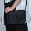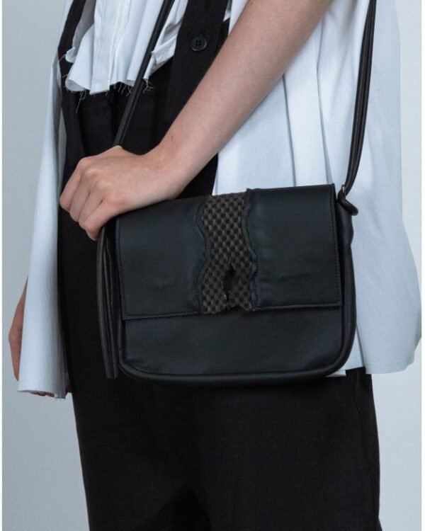 Black crossbody bag made of leather with mesh fabric detail on the front. Rubber straps.