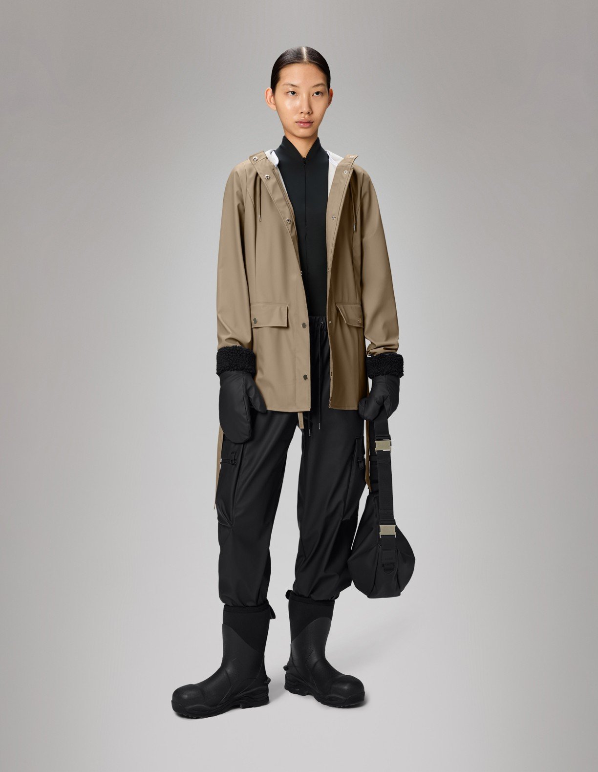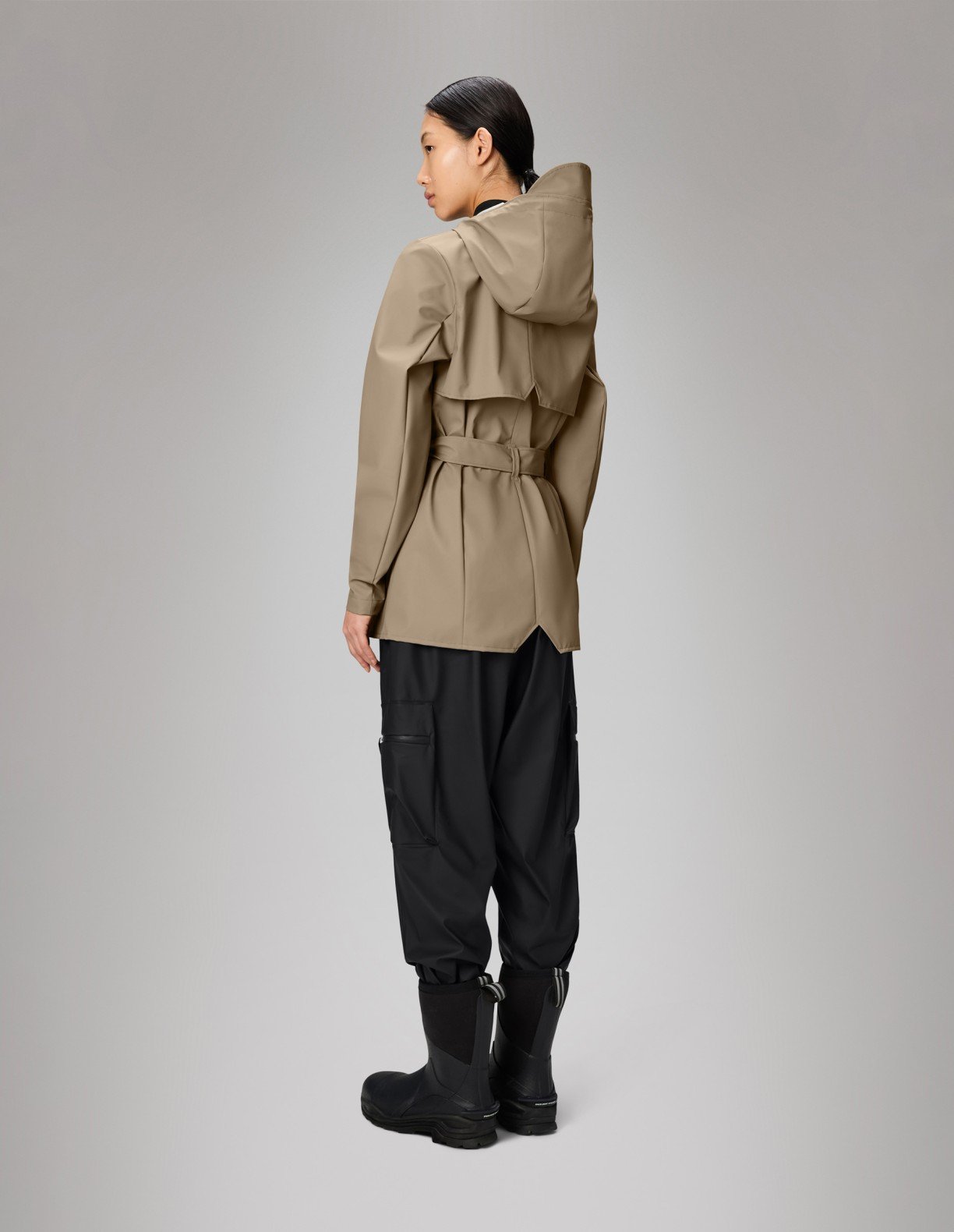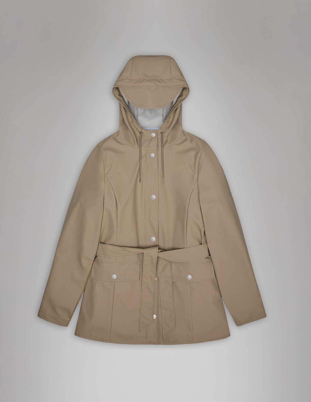 Beige waterproof trench coat with belt. Minimalist design with adjustable hood and zipper under flap with snaps.