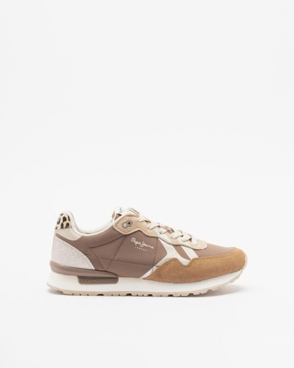 Camel-colored sneakers in nylon and suede fabric with shiny details. Tiger print detail on the heel and Pepe Jeans logo on the side.