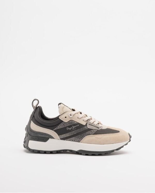 Black nylon sneakers with beige suede details. Rhinestone decoration and Pepe Jeans logo printed on the side.