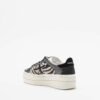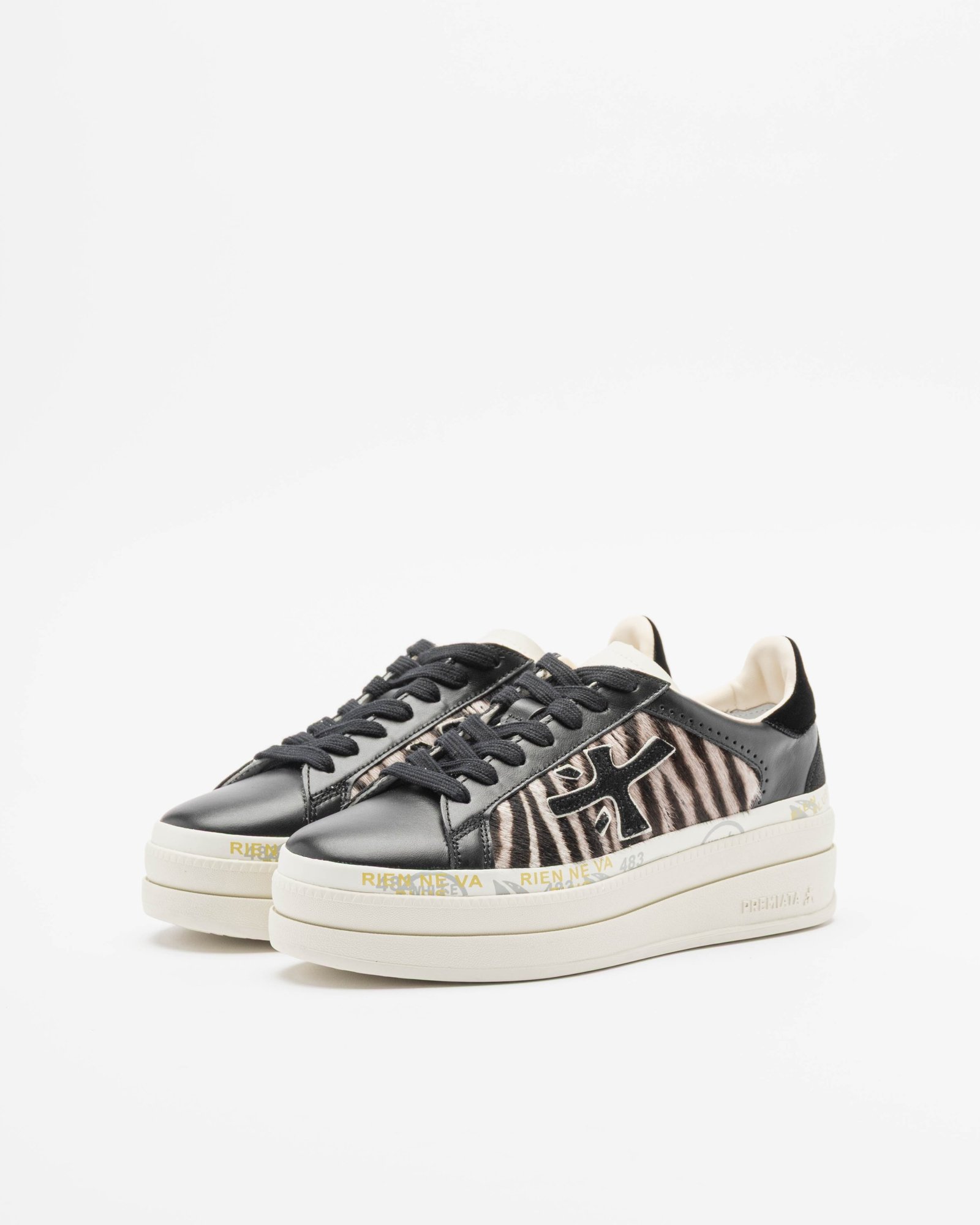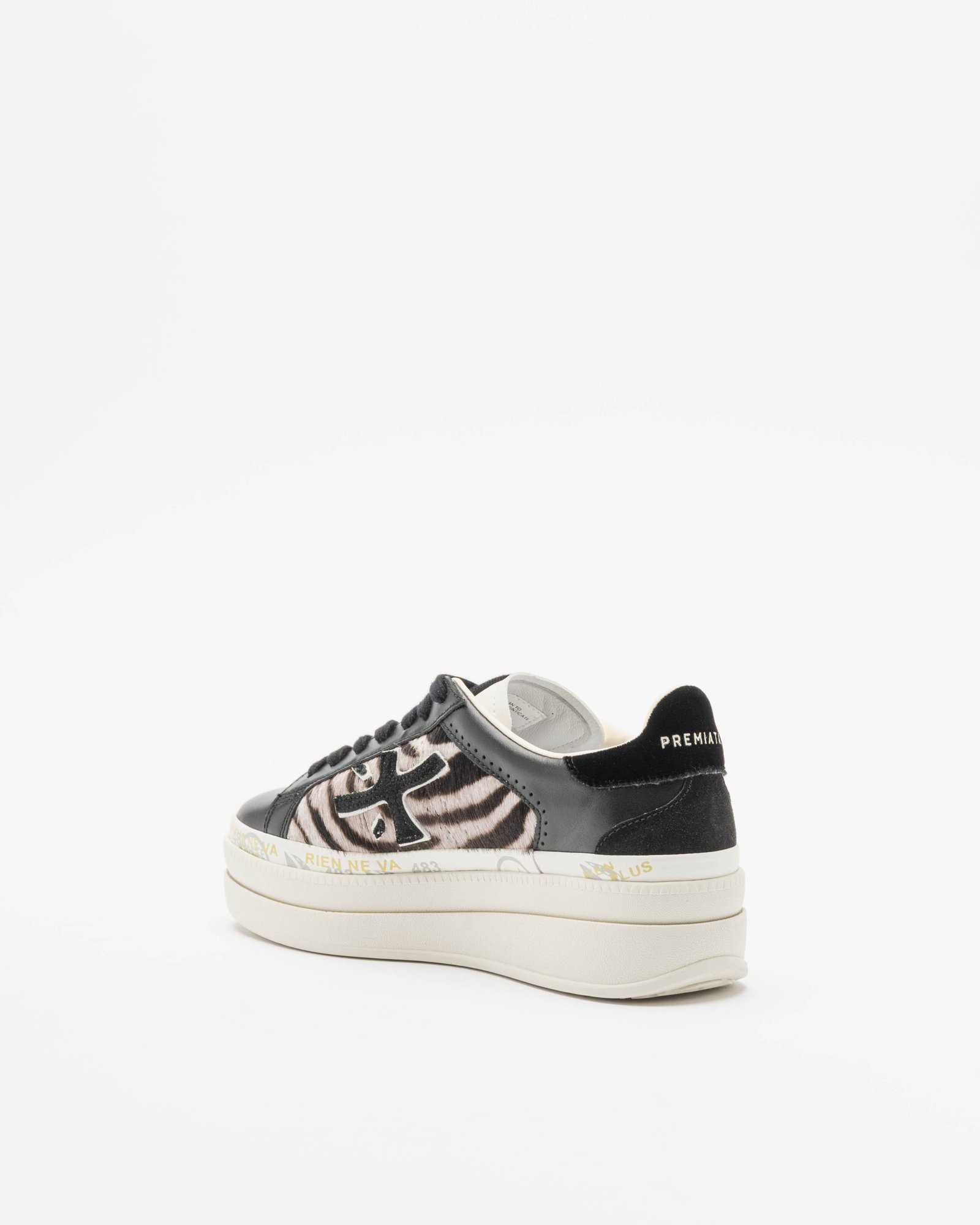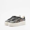 Black leather sneakers with suede details and a platform sole. Sides covered in synthetic fur with a zebra pattern.