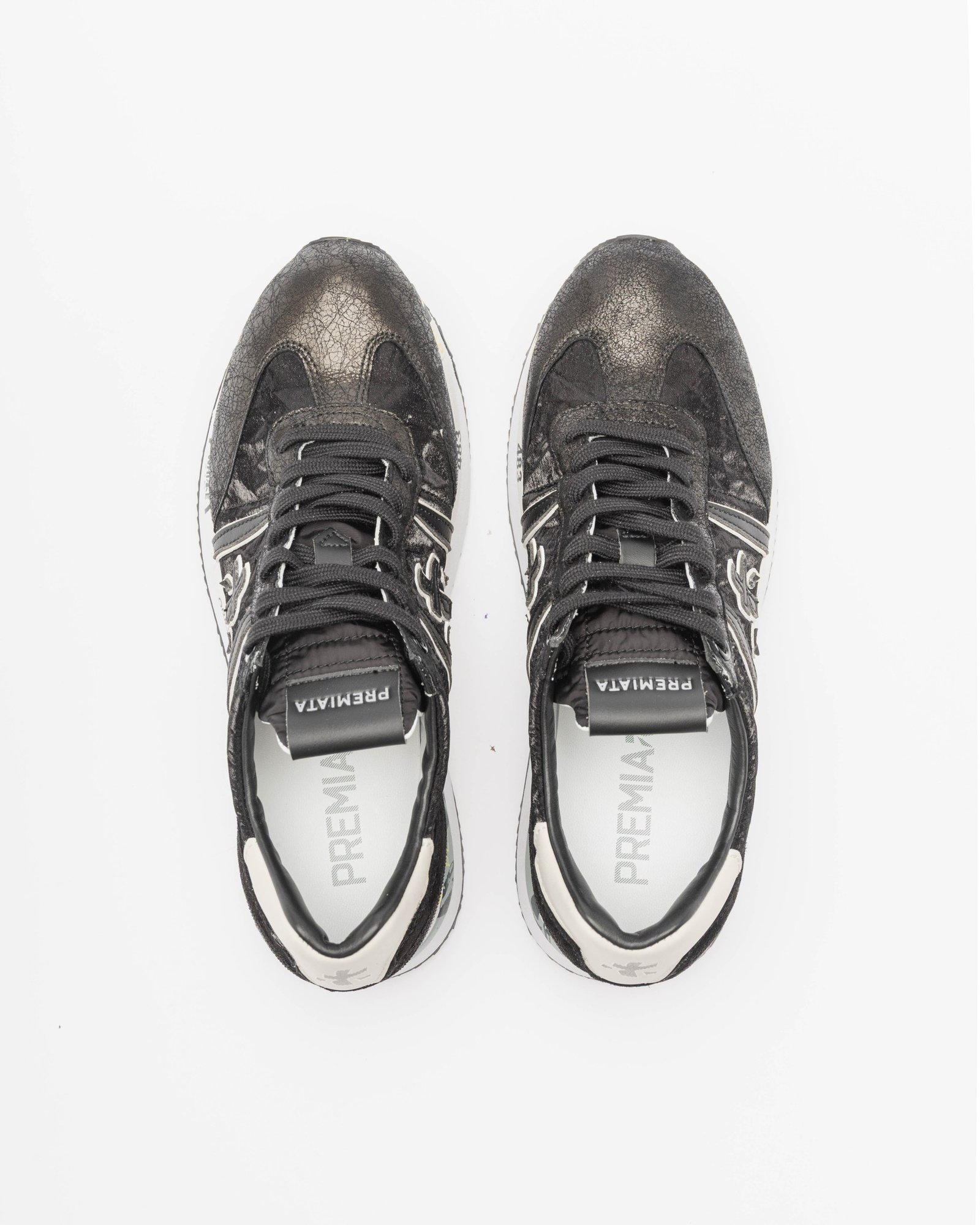Black sneakers with a glossy finish crafted from a mix of materials. Exclusive double sole and Premiata logo on the