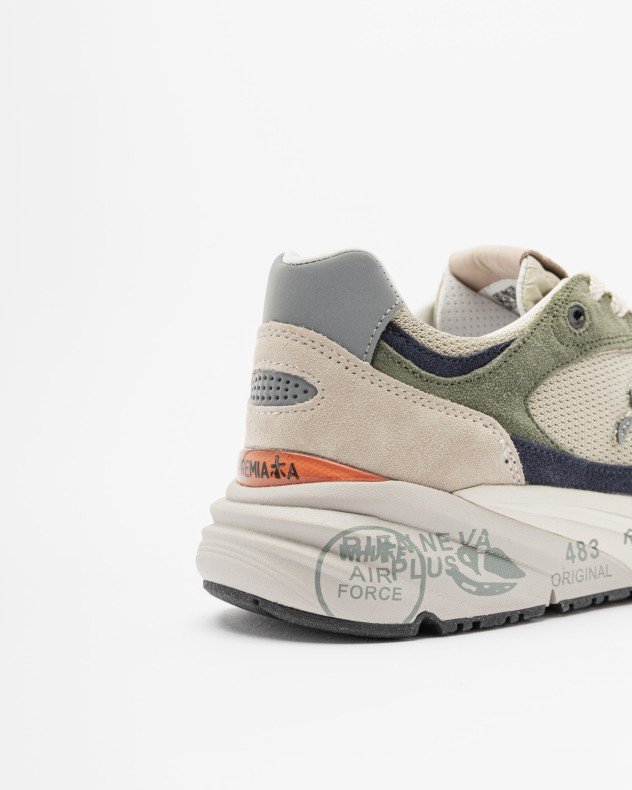 Green trainers in a mix of materials with reflective details and contrasting accents. Exclusive sole and Premiata logo stitched on the sides.