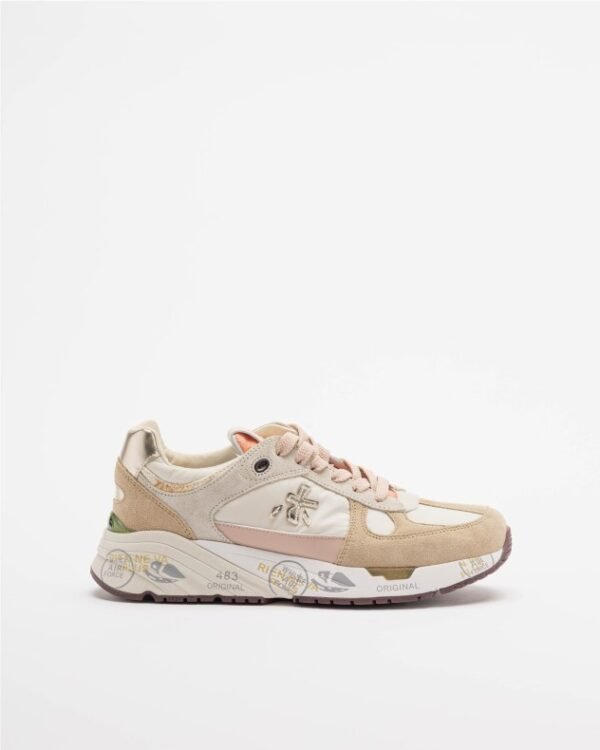 Beige women’s sneakers crafted in a mix of materials and colors. Exclusive Premiata sole and metallic logo on the sides.