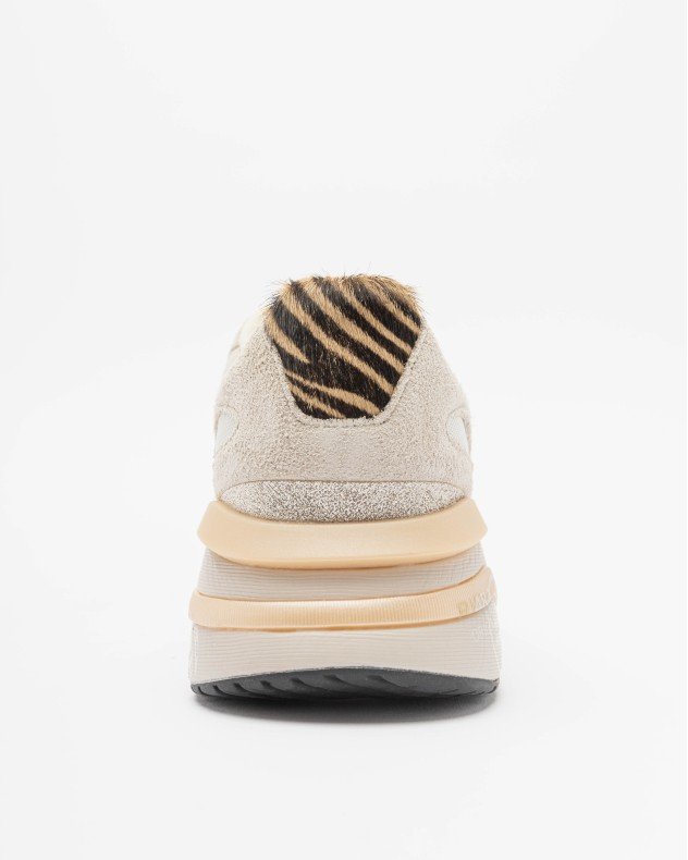 Premiata sneakers constructed with a mix of materials and colors. Zebra detail on the heel, gold logo on the sides, and exclusive rubber sole.