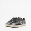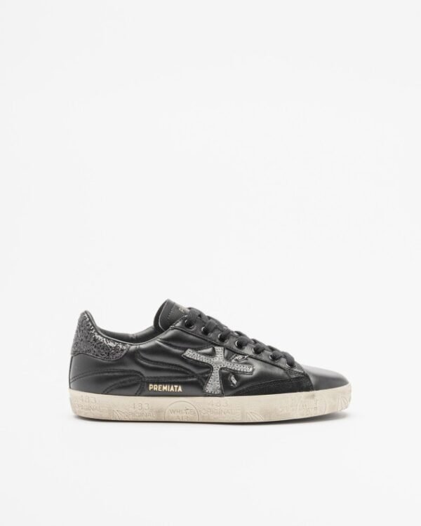 Black sneakers in a quilted leather blend with sequin detailing. Metallic Premiata logo on the sides.