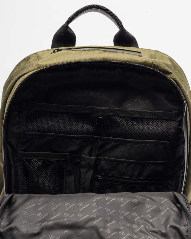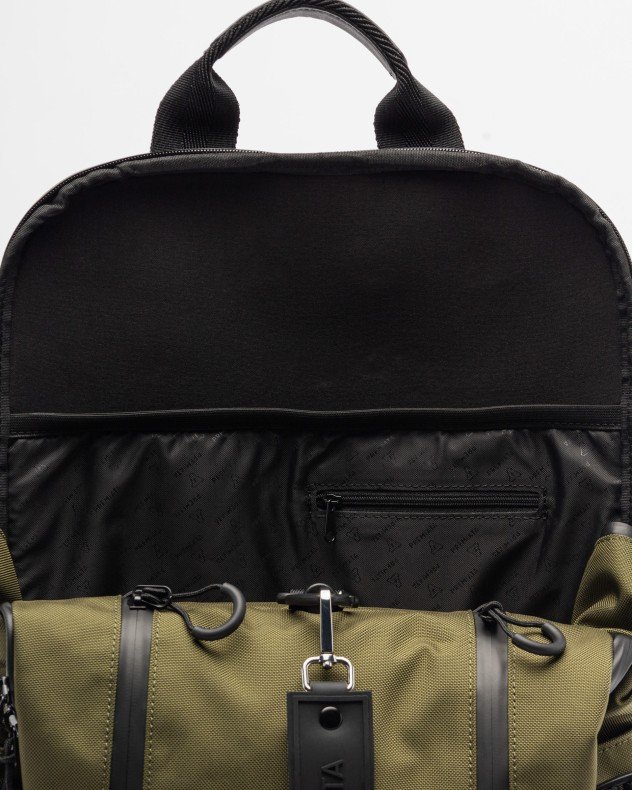 Green backpack with multiple pockets and metallic hook on the front with personalized keychain by Premiata.