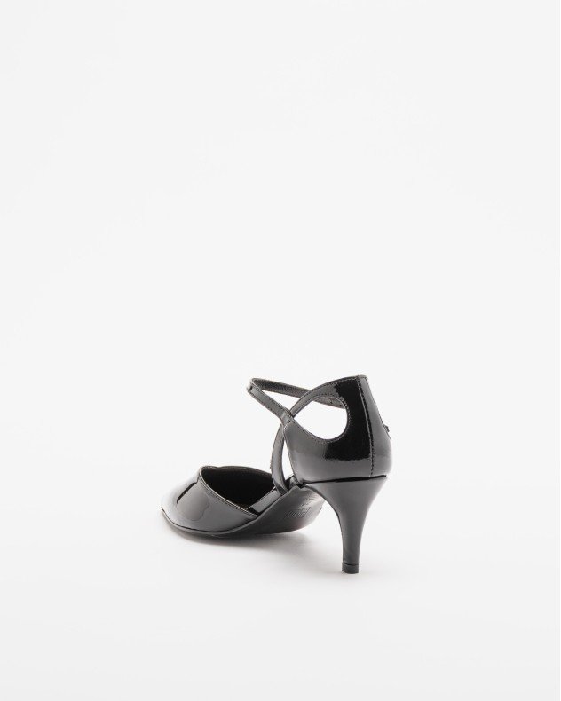 Black shoes in patent leather with stiletto heel, pointed toe and buckle at the ankle.