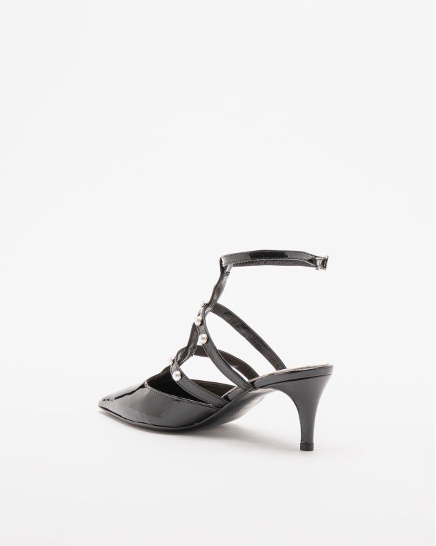 Black shoe with varnished effect and decorative pearls. Pointed toe and ankle strap with buckle.