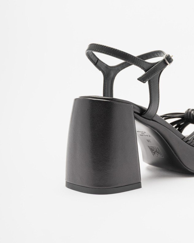 Beige suede sandals with a block heel and platform. Thin straps tied in a bow at the front and a buckle at the ankle.
