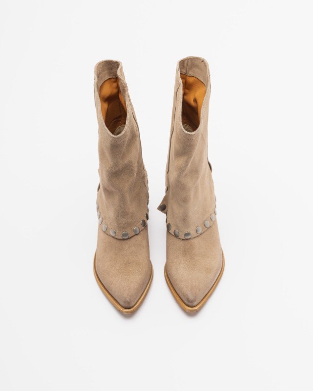 Cowboy boots in camel suede with stud detailing on the shaft.