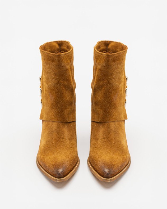 Beige suede boots with decorative buckles on the side.