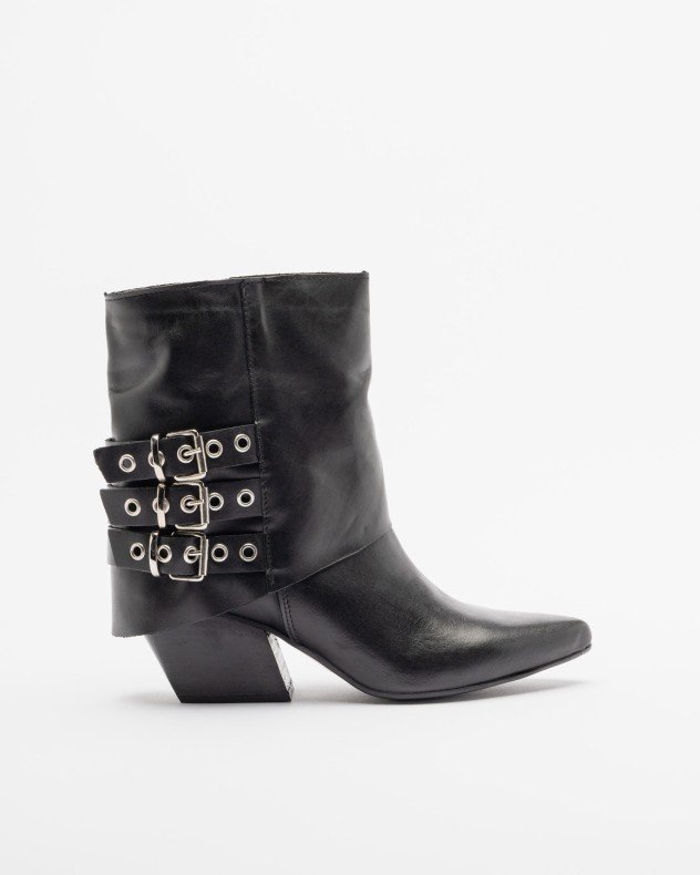 Beige suede boots with decorative buckles on the side. Fold-over shaft and pointed toe.