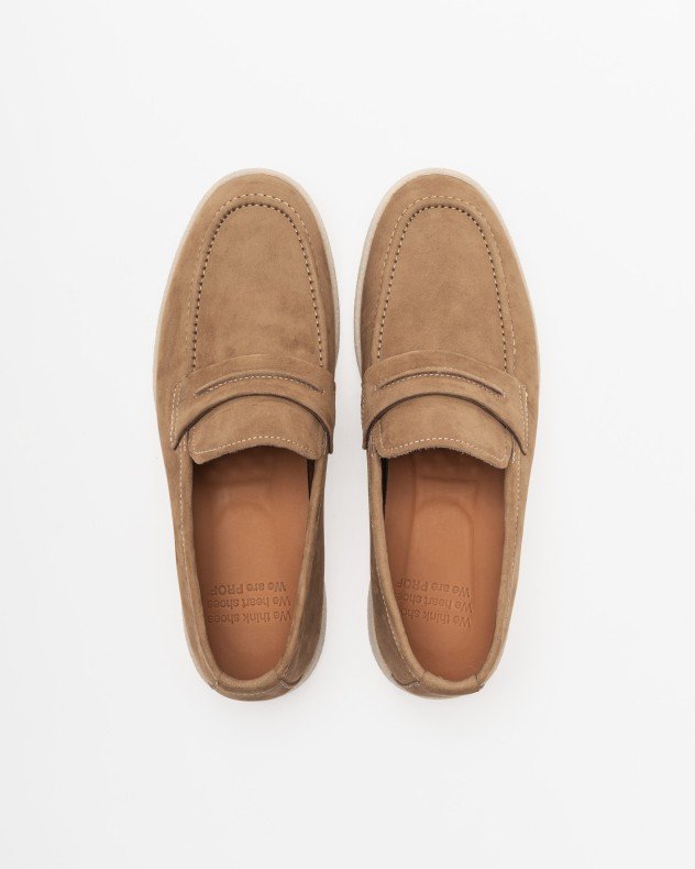 Beige nubuck loafers for men with rough rubber soles.