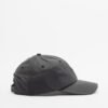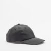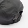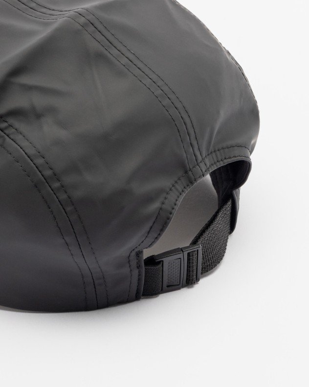 Black baseball cap by Rains. Curved brim and adjustable strap with buckle at the back.