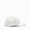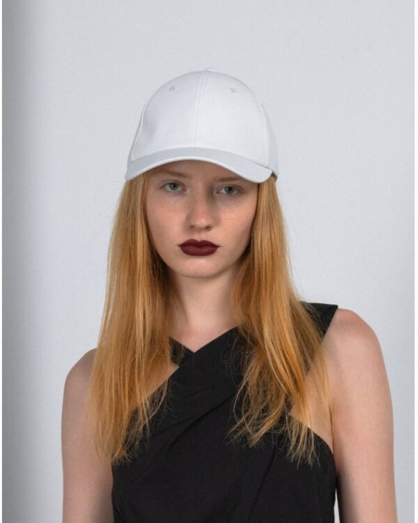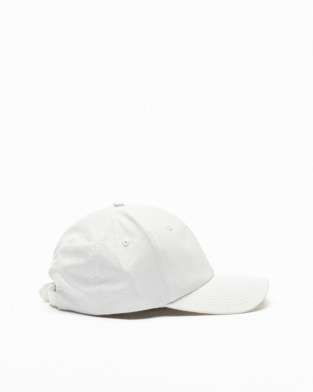 White baseball cap by Rains. Curved brim and adjustable strap with buckle at the back.
