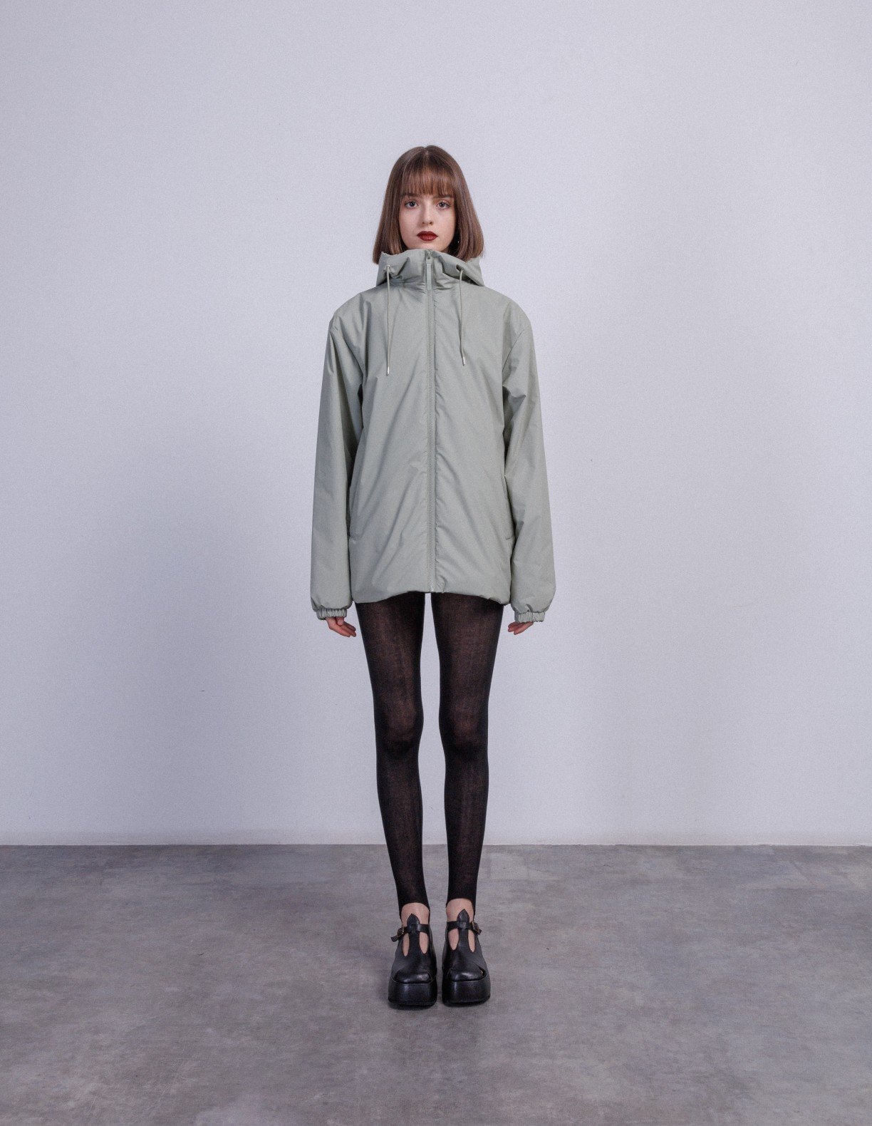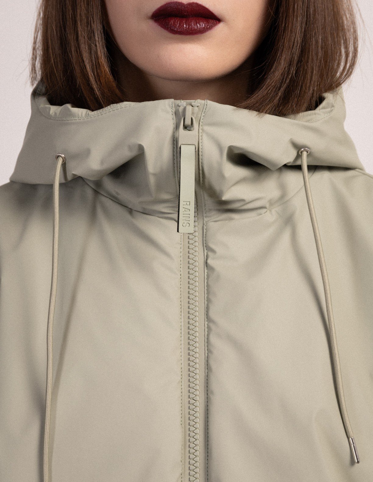 Green waterproof, windproof, and padded Rains jacket. Rains PU waterproof coating.