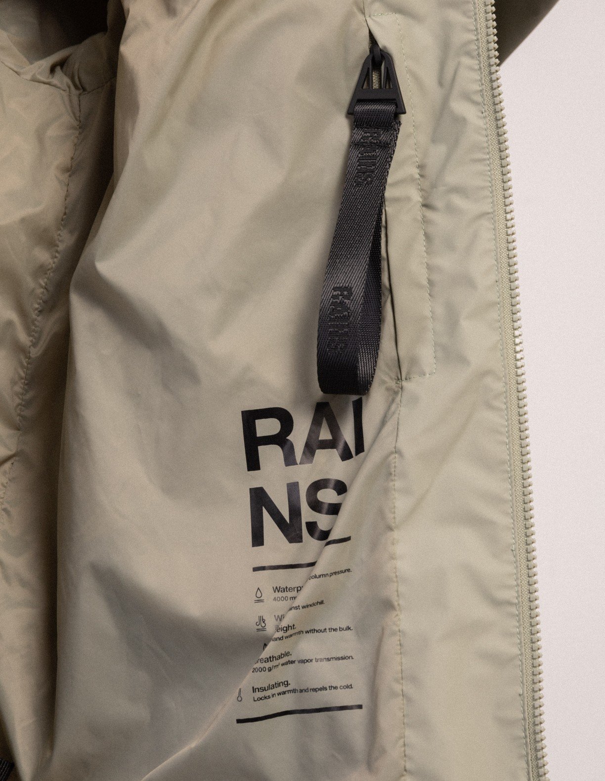 RAINS patch on left sleeve.