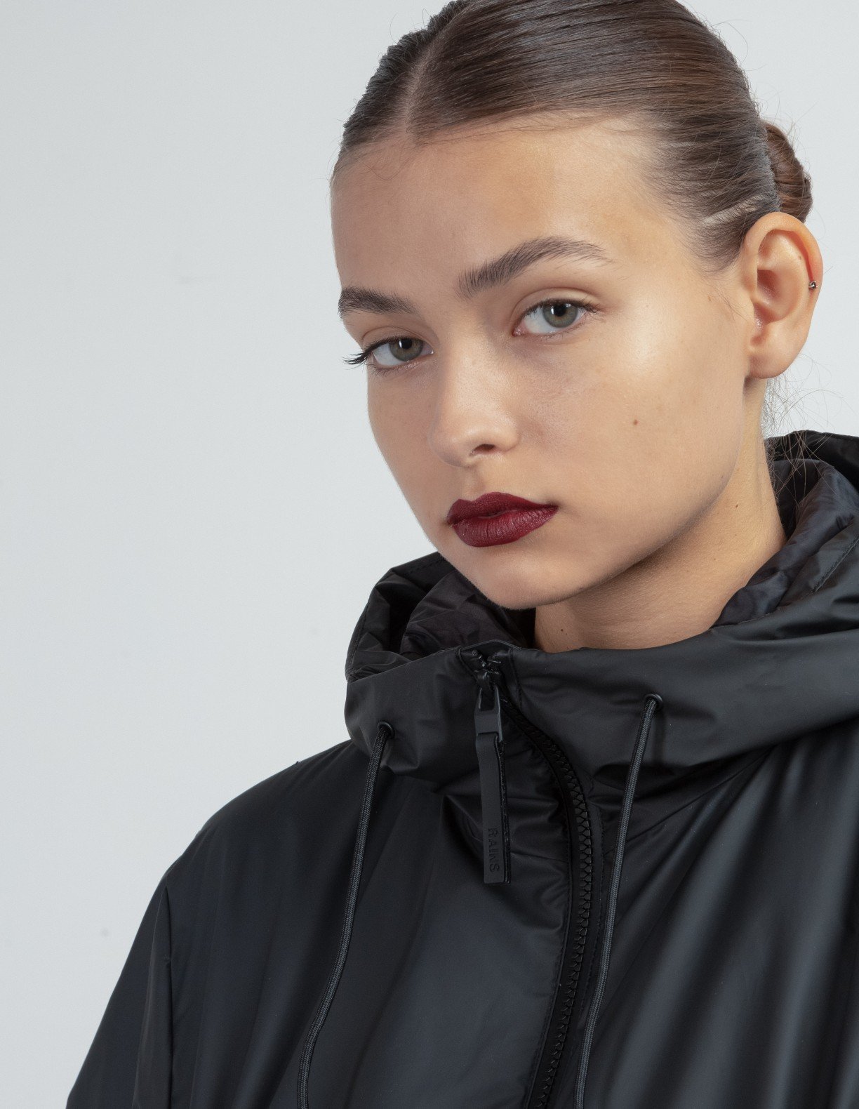 Women’s black waterproof jacket by Rains. Lightweight padding and exclusive polyurethane coating.