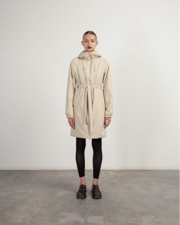 Beige waterproof jacket with light padding and belt. RAINS patch on the left sleeve.
