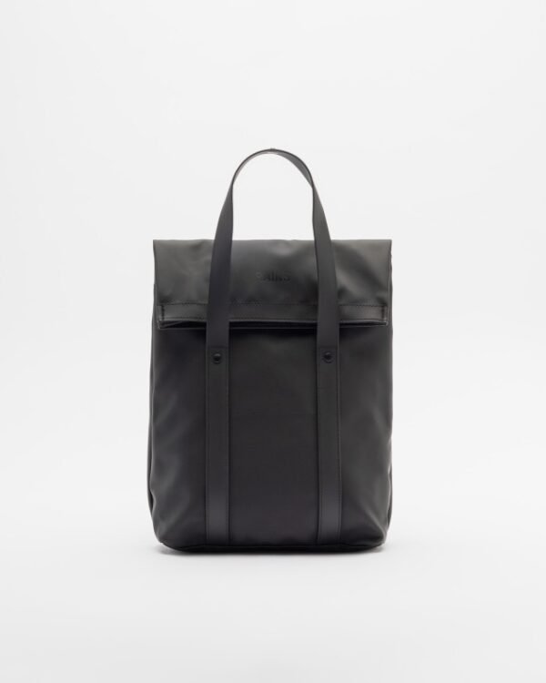 Waterproof black backpack with a simple design and a functional pouch option. Foldable top opening and TPU strap details with top handles.