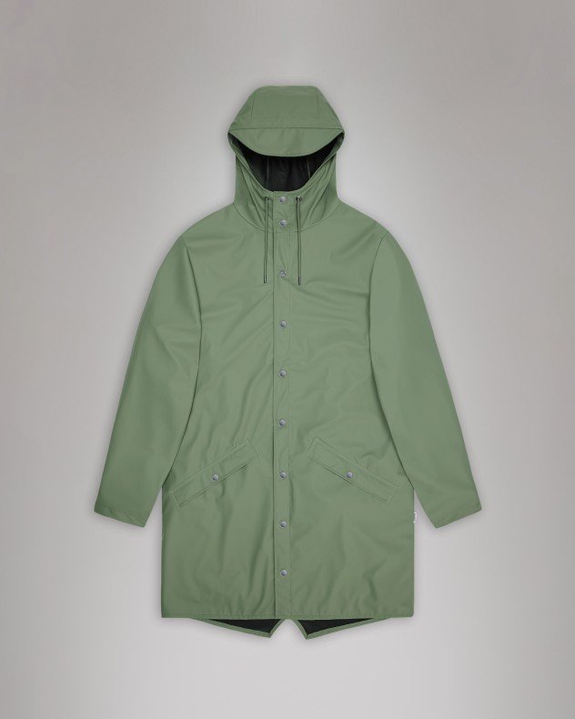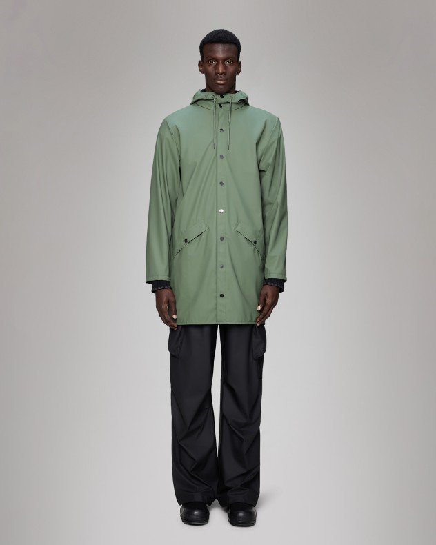 Long green parka for men made from RAINS’ exclusive waterproof fabric. Designed with a high collar and adjustable hood, original button fastening and side pockets.