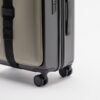 Green 4-wheel suitcase with carry-on dimensions and a waterproof design. Two spacious compartments with cross-over elastic and mesh closures.