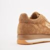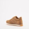 Sapatilhas camel da Love Moschino em tecido e camurça com padrão acolchoado. Sola de plataforma e logo metálico dourado na lateral.