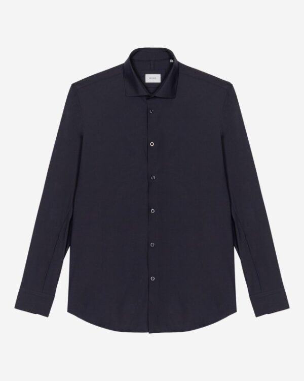 Men’s blue shirt in a polyester and elastane blend with a satin finish.