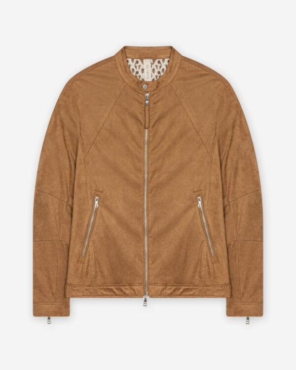 Camel mens jacket with a suede-effect finish and Seinse label on the collar. Features a front zip fastening and side pockets with zips.