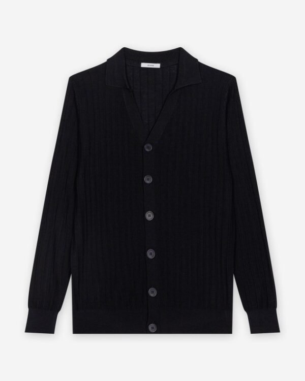 BDark bue ribbed knit jacket with a V-neck and button fastening at the front.