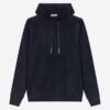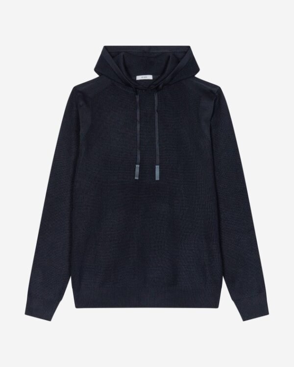 Blue knit hooded sweater with ribbed design and Seinse side label.