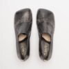 Women’s black shoe crafted from a worn-effect leather upper. Asymmetrical toe and cylindrical heel with relief.