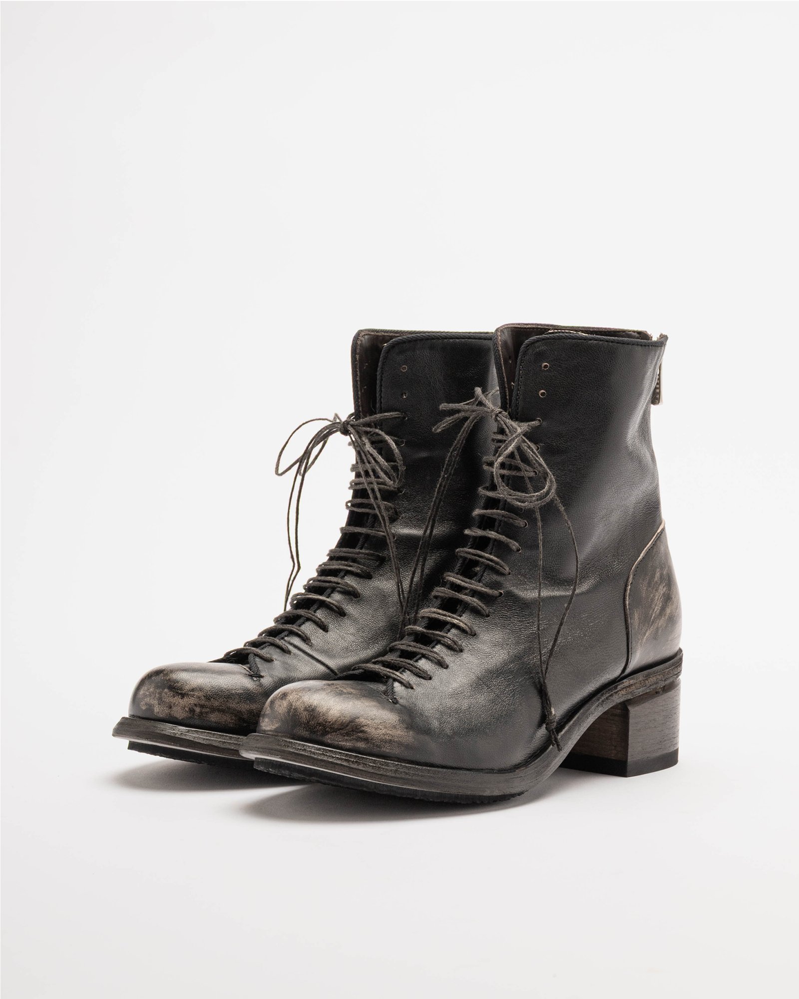 Black leather ankle boots with a distressed effect. Medium heel and back zip fastening.