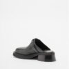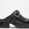 Black leather clogs with a grainy texture. Square toe, mid-heel, and decorative buckle.