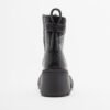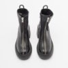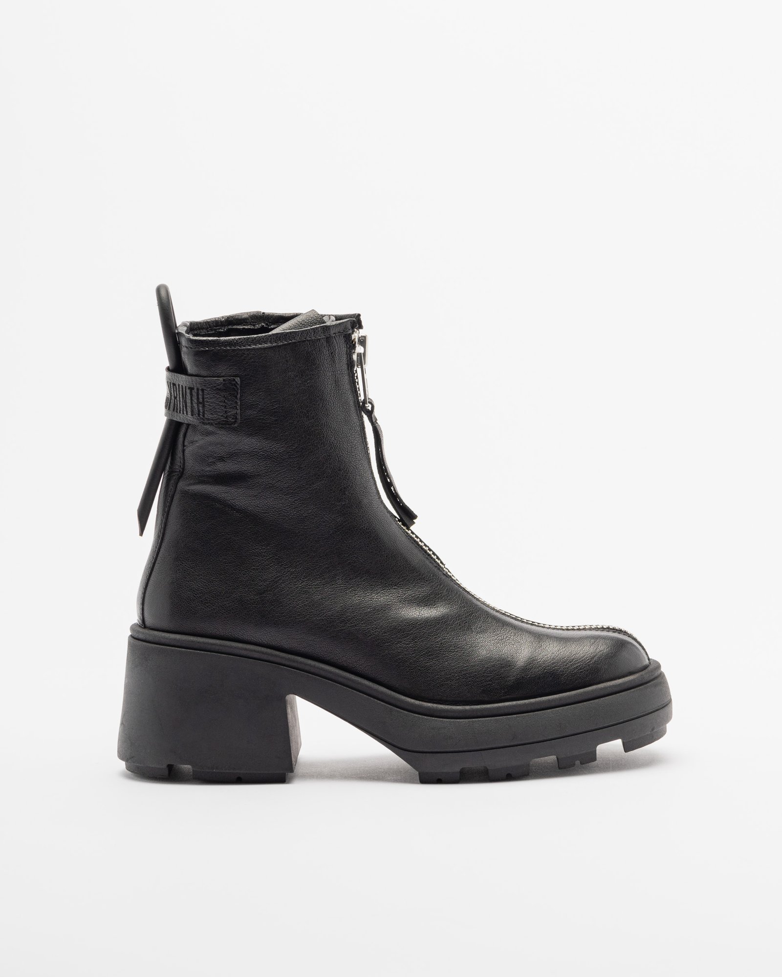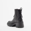 Black leather ankle boots with front zip fastening and logo detail at the back.