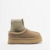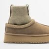 Green suede boots with a platform sole and a stretchy fabric shaft lined with fur. Quilted detail with contrasting stitching.