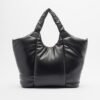 Large black Love Moschino tote bag crafted from faux leather with a padded effect. Highlights include the double handle, Love Moschino heart pendant detail, and gold Love Moschino logo on the front.