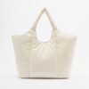 Large white Love Moschino tote bag crafted from faux leather with a padded effect. Highlights include the double handle, Love Moschino heart pendant detail, and gold Love Moschino logo on the front.