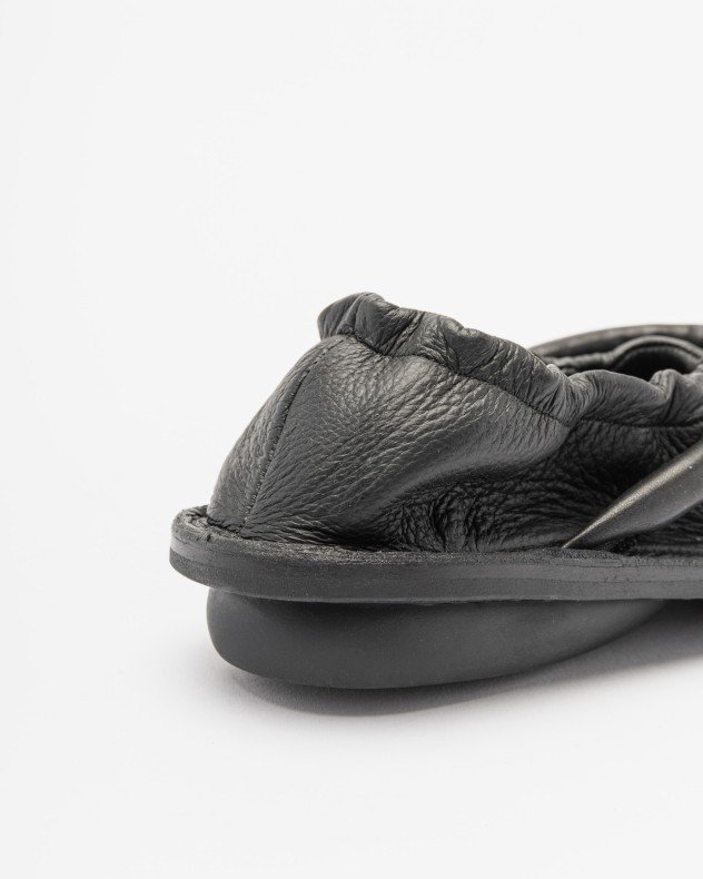Black leather ballerinas with a crinkled collar and a padded strap at the top. Rubber sole with signature Trippen embossing.
