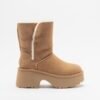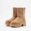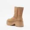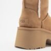 UGG platform boots in camel-colored sheepskin with a double-sided 10mm thick upper, featuring a sheepskin strap detail and an embossed UGG logo patch on the back.