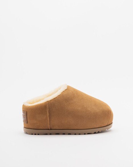 UGG Pumped Slide clogs with a chunky design. Padded camel suede upper and leather logo on the back.