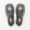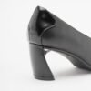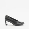 Black leather shoes, characterized by an asymmetrical toe and curved heel with silver detailing.